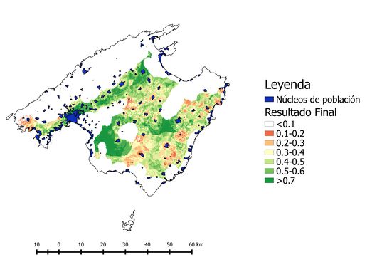 El proceso de obtención de los resultados se dividió en dos fases: primero se multiplicaron todas las capas que asignaban un coeficiente a cada terreno, obteniendo unos resultados parciales que se extendían por toda la isla y, posteriormente, se les añadieron las capas excluyentes obteniendo así los resultados finales.