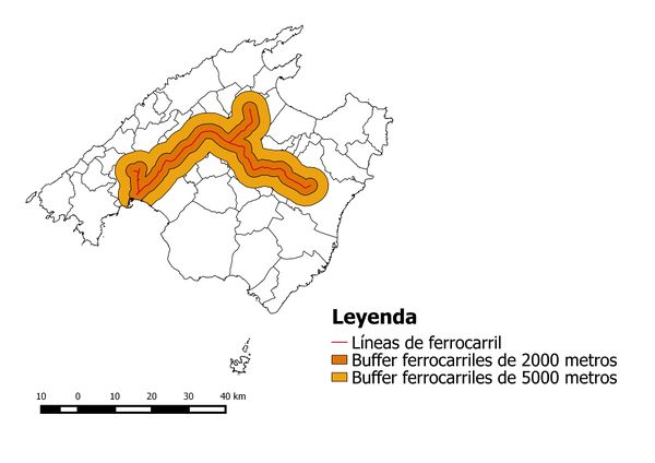 También se ha tenido en cuenta la presencia del ferrocarril en este criterio debido a que una buena conexión con el ferrocarril de Mallorca beneficiaría a las personas que no dispongan de un coche y quieran realizar el viaje a una ciudad o zona de la isla de forma más económica. Se han realizado dos buffers, uno a una distancia de 2000 metros al que le daremos un valor de ponderación de 0,8 y el otro buffer se encuentra a 5000 metros con un valor de 0,4. Esto sale un resultado como el que se muestra en la siguiente imagen.