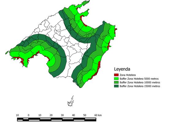 Para analizar las zonas hoteleras hemos realizado tres búferes de gran longitud que abarquen mucho territorio, de manera que representen las zonas de influencia de los centros hoteleros. Estas zonas de influencia son aptas para la localización del aeropuerto por su cercanía a las zonas más turísticas de la isla.