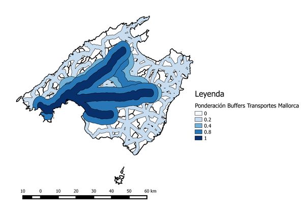 Las carreteras autonómicas tendrán una valoración mucho menor que las autovías debido a su mayor dificultad de circulación y peor conexión a las ciudades. Se ha creado un sólo buffer que se encontrará a 1000 metros y tendrá un valor de 0,2 por las razones mencionadas anteriormente. Y el resto de Mallorca tendrá un valor cero, teniendo un aspecto como el que se muestra en esta imagen.