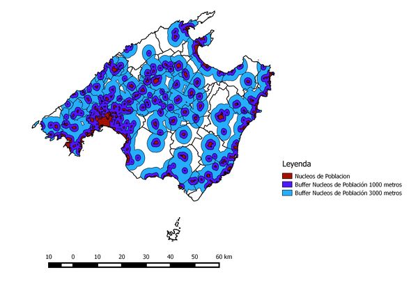 - Los núcleos de población se han analizado con dos búferes con la siguiente ponderación: