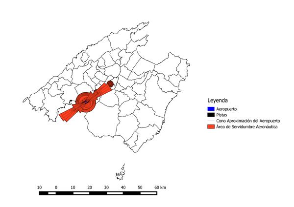 En nuestro estudio, hemos considerado este criterio como excluyente, pues el futuro aeropuerto no puede construirse en una zona que interrumpa el espacio aéreo del aeropuerto existente en la isla. Por esto, se decide otorgar a esta capa un valor nulo para que en el momento de obtener el resultado final, sea multiplicada por ella y esto haga que estas zonas sean descartadas. La capa que refleja la servidumbre del aeropuerto existente en la isla de Mallorca es el siguiente: