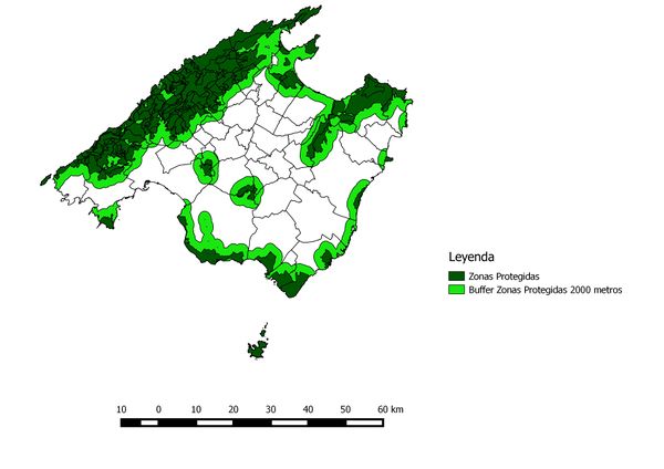 En nuestro problema hemos realizado un buffer que se encuentra a una distancia de las zonas protegidas de 2000 metros, lugar el cual tendrá un valor nulo para que en el resultado final sea multiplicado por esta capa descartando estas zonas para construir. La capa vectorial resultante tiene el siguiente aspecto.