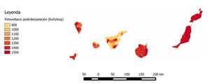 Una vez obtenido el mapa ráster de Fotovoltaico postinterpolación en una escala de amarillos naranjas y rojos (mapa 1) podemos sacar las primeras conclusiones en nuestro trabajo. En cada una de las Islas Canarias encontramos zonas con valores superiores a 1500 kWh/kWp localizándose la mayoría de estos en las zonas septentrional. Según el IDEA (Instituto para la diversificación y ahorro de energía) la energía generada por kWp al año, incluyendo pérdidas en Las Palmas de G. Canaria es 1.785 kWh/kWp y en Santa Cruz Tenerife 1.832 kWh/kWp. Así que entendiendo que las zonas de mayor potencial ya han sido aprovechadas, establecemos nuestro umbral en 1500 kWh/kWp. Por ello solo se realizará análisis de las zonas que presenten un valor que supere el umbral. Para realizar esta operación utilizamos en QGIS GRASS. Los pasos a realizar son los siguientes: