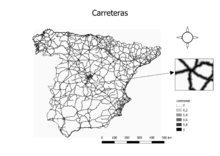 Nota: La capa de transportes del BTN100 contiene en formato vectorial todos los tipos de carreteras que hay en España, así que realizamos un proceso de filtrado recurriendo a los códigos de las distintas vías y a la tabla de atributos: autopistas, cód. 11; autovías, 12; carreteras nacionales, 13; y carreteras de primer orden, 15. Una vez filtradas, se extraen por separado, se unen en una capa común y ya se puede proceder como hemos explicado con anterioridad.