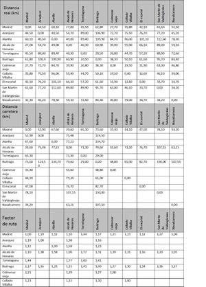 Hemos calculado las distancias más cortas hasta cada uno de los pueblos del estudio para las localidades de Madrid, Alcalá de Henares y Buitrago de Lozoya. A su vez hemos medido la distancia geométrica entre estas localidades. A continuación obtenemos el factor de ruta. Este se calcula mediante la siguiente operación: Factor de ruta (de A a B)=(Distancia más corta(distancia real por carretera) de A a B)/(Distancia geométrica de A a B) Este proceso se repite para las localidades de Madrid, Alcalá de Henares y Buitrago de Lozoya obteniendo los siguientes resultados:
