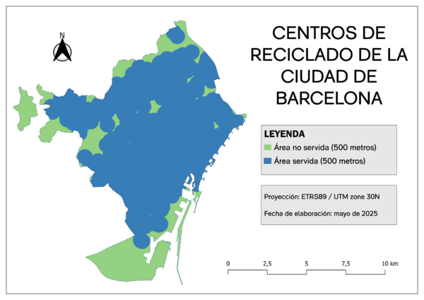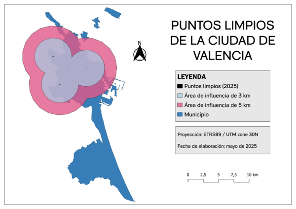 Una vez recopilada y procesada toda la información geográfica, se procedió a delimitar el contorno de cada municipio como unidad de análisis espacial. Sobre esta base, se generaron áreas de influencia en torno a cada tipo de infraestructura, aplicando radios específicos cuidadosamente seleccionados en función de criterios de accesibilidad, frecuencia de uso y escala territorial de cada servicio. En concreto, se utilizaron los siguientes valores: 300 metros para los carriles bici, 500 metros para los centros de reciclado y 5 kilómetros para los puntos limpios. Además, con fines explicativos y didácticos, se han representado en los mapas las áreas de influencia de 300 metros en torno a los centros de reciclado y de 3 kilómetros en torno a los puntos limpios, como referencias visuales claras del grado de cobertura de estas infraestructuras en cada municipio. Posteriormente, se calculó el área municipal cubierta y no cubierta por cada servicio, mediante operaciones de intersección espacial.
