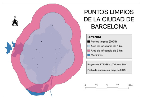 La acción climática urbana ha adquirido una relevancia creciente en las agendas políticas locales, y su evaluación requiere herramientas técnicas capaces de integrar información espacial y temática diversa. En este contexto, el presente estudio utiliza herramientas de análisis geoespacial para medir el grado de implantación de infraestructuras clave para la sostenibilidad urbana. En particular, se han considerado tres dimensiones fundamentales: la gestión de residuos, a través de la distribución de centros de reciclado y puntos limpios; la movilidad sostenible, mediante la cobertura del territorio por infraestructuras ciclistas; y la densidad de dichas infraestructuras en relación con la extensión del municipio.