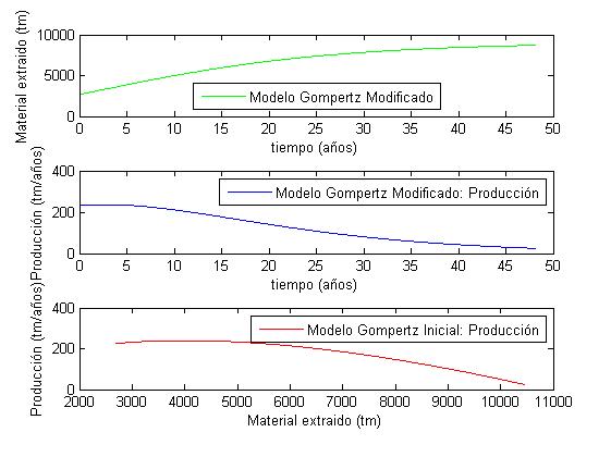 La producción máxima resulta ser 239.9993 ton. y se alcanza en 157 años. Además quedarán sin extraer 288.8542 ton. De esta gráfica podemos extraer la conclusión de que el modelo de logístico no se ajusta a la realidad ya que no solo la producción máxima es, en realidad, mayor sino que el tiempo necesario para alcanzar dicho valor es muy superior a la realidad. Podemos concluir que en caso de elegir uno de los dos modelos es más recomendable es el modelo de Gompertz por ajustarse más a la realidad.