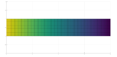 Observamos en el gráfico que a medida que el fluido avanza por el canal la presión va disminuyendo, las presiones altas están representadas con colores cálidos y las más bajas con colores fríos. Esto es así, porque para mantener el caudal de un fluido viscoso estable debe mantenerse una diferencia de presiones entre las paredes del canal. Esta diferencia de presión es necesaria debida a la fuerza de arrastre o frenada que ejerce el canal sobre la capa de fluido en contacto con él y la que ejerce cada capa de fluido sobre la adyacente que se está moviendo con distinta velocidad. A estas fuerzas las denominamos fuerzas viscosas. El resultado de su presencia, hace que la velocidad del fluido no sea constante a lo largo del canal siendo mayor cerca del centro y menor cerca de las paredes tal como se explicó y demostró en el apartado anterior.