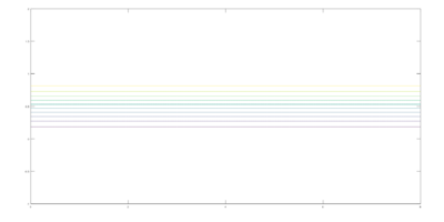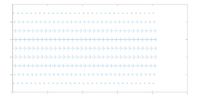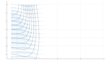 Lo primero que observamos, es que la velocidad es nula en las paredes del canal pues en [math]z=1[/math] y [math]z=0[/math] no existen líneas de campo, como ya habíamos demostrado analíticamente. Además, en las deducciones previas habíamos asegurado que la velocidad sería paralela a las paredes del canal, cosa que también observamos en la gráfica, pues las líneas de campo son paralelas a las rectas [math]z=1[/math] y [math]z=0[/math] que coinciden con las paredes del canal.