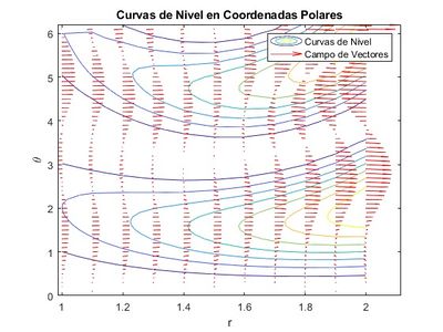 quiver(R, TH, Gx, Gy, 'Color', 'r'); % Dibuja un campo de vectores sobre las curvas de nivel