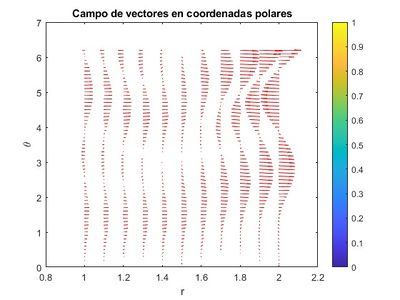 title('Campo de vectores en coordenadas polares'); % Añade un título a la figura