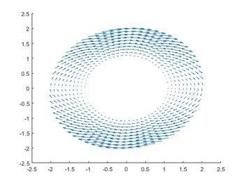 quiver(R, TH, Dx, Dy, 'Color', 'r'); % Dibuja un campo de vectores (quiver plot) con colores cálidos