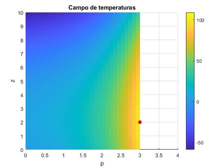 El gradiente de temperatura (\(\nabla T\)) nos dice cómo varía la temperatura en función de cada punto y de sus coordenadas \((\rho, \theta, z)\). Esta temperatura viene expresada en función de coordenadas cilíndricas, luego para calcular el gradiente de la temperatura utilizaremos la siguiente fórmula.