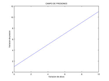 Por lo tanto, el campo de presiones muestra que la presión depende linealmente de la altura [math]z[/math]. A medida que [math]z[/math] aumenta, la presión también lo hace, y viceversa.