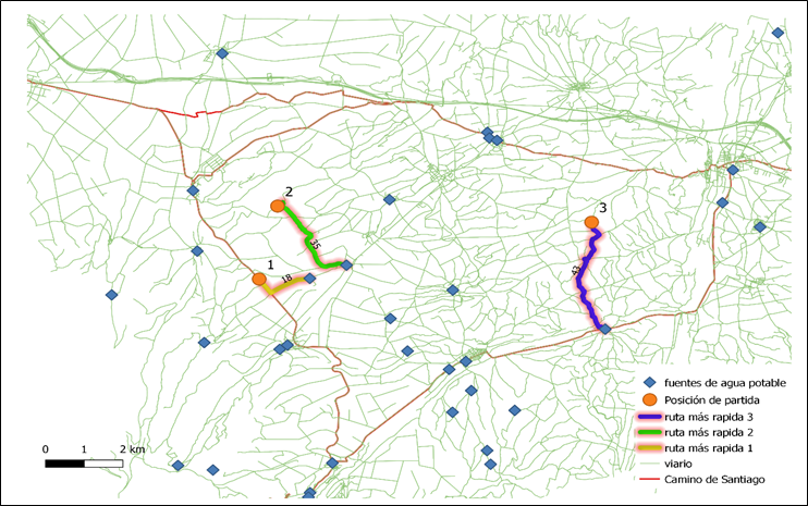 El objetivo final no fue especialmente complicado de resolver la recogida de datos tomó un poco más de lo esperado al haber sido la primera idea del proyecto la realización del mismo ejercicio dentro de la ciudad de Logroño, al no haber encontrado un numero relativamente grande de fuentes se decidió ampliar a toda la comunidad.Para demostrar el correcto funcionamiento del programa, lo ejecutamos para tres puntos diferentes, dos de ellos en lugares aleatorios y uno suponiendo que partimos de la traza del Camino de Santiago. El resultado obtenido es la traza de las rutas más rápidas y el tiempo de demora que estas supondrían en minutos. Siendo para los puntos de partida 1,2 y 3, 18, 35 y 43 minutos respectivamente.
