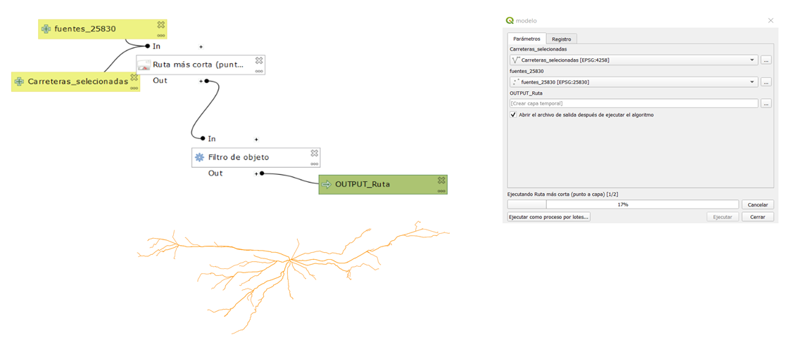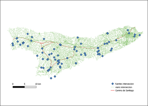 El proceso comienza con el desbroce de todos los elementos irrelevantes de las capas de datos, esto se realiza con un buffer y con las herramientas de geoproceso vectorial. Se toma como referencia una capa shape equivalente al camino de Santiago para crear un buffer que nos permita seleccionar datos a una distancia razonable. Tras ello con la función ruta más corta de punto a capa, QGIS 3.14, a partir de un punto se obtienen tantas rutas como posibles soluciones hay. Ahí lo que hacemos es seleccionar manualmente la que tenga menor coste, es decir la que es mas corta. De esta forma se obtiene la solución deseada.