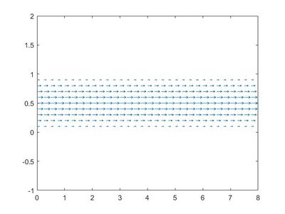 Suponemos que la velocidad del fluido en [math]y=0,1[/math] coincide con los planoes inferior y superior respectivamente, por lo que finalmente llegamos al campo vectorial de velocidades.