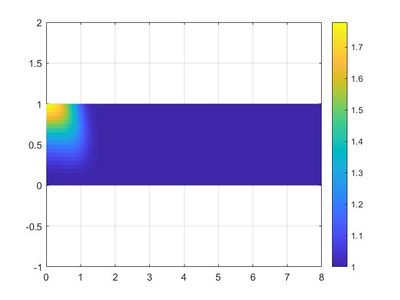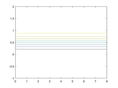 La representación gráfica de la superficie que ocupa el fluido en los puntos interiores del rectángulo de dimensiones [math][0,8]×[0,1][/math], y con ejes [math]y,z[/math] definidos en los intervalos [math][0,8]×[-1,2][/math], respectivamente, es la mostrada en la siguiente figura: