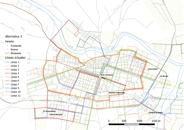 Para ello, se proponen 3 alternativas de trazado, de las que se elige la mejor mediante un análisis de la población afectada. Para poder llevar a cabo este análisis, se ha de calcular la densidad de las secciones censales de Logroño y la población cercana al nuevo trazado. Igualmente, ha de evaluarse la accesibilidad de puntos clave de la ciudad, grandes atractores de viajeros, como son el Hospital San Pedro, la estación, la comisaría de Policía, la Universidad de la Rioja o diversos centros comerciales en relación a la disposición actual de las líneas y a la situación con la mejora implementada.