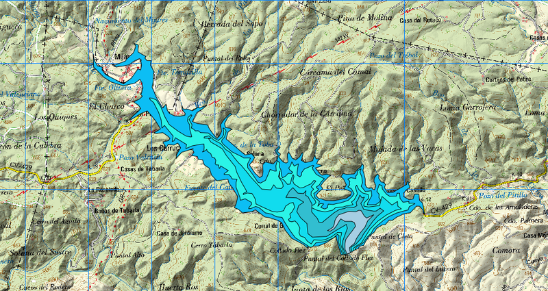 Los distintos niveles de embalse se han representado mediante polígonos digitalizados hasta alcanzar la cota máxima de la presa. La imagen siguiente representa el área inundada a las diferentes cotas, desde la cota 420m a la 460m. Se puede apreciar como con poca altura de presa se embalsa una cantidad importante de agua.