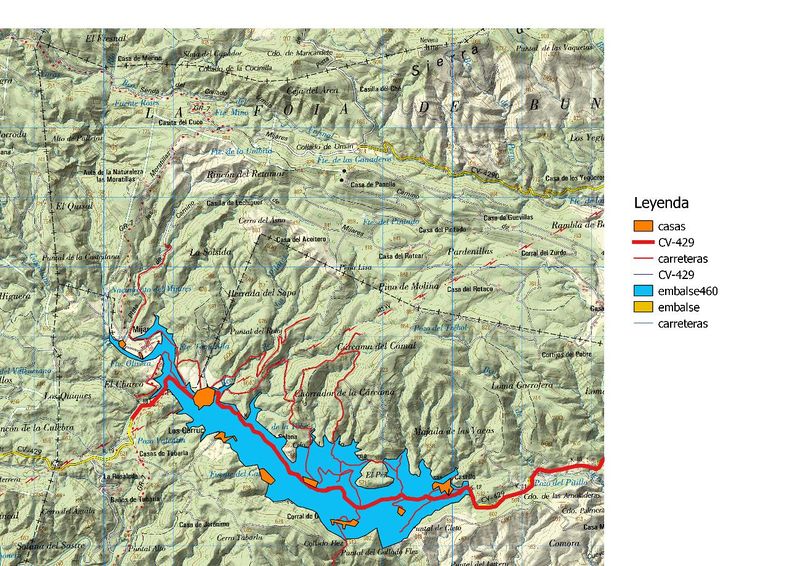 La figura siguiente representa las afecciones que generaría el embalse a la cota máxima admisible de 460 metros. Se puede observar como a este nivel de llenado las afecciones son importantes, ya que se inundaría gran parte de la carretera CV-429, que es la más importante en esta zona, así como otras carreteras secundarias.