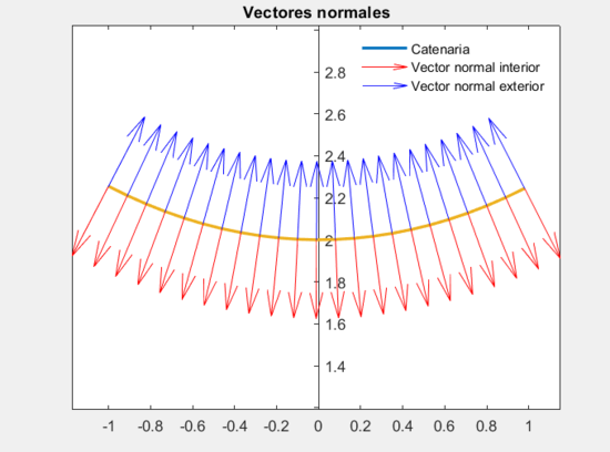 quiver(t_i, A * cosh(t_i / A), v_x, v_y, 'r', 'AutoScale', 'on', 'MaxHeadSize', 0.5);