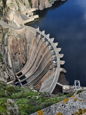 Por su parte, las presas de arco aprovechan su forma curva para transmitir la fuerza del agua hacia los estribos, las partes laterales del valle, lo que las hace ideales para valles estrechos y profundos. Este diseño requiere estribos sólidos y un material de alta resistencia en la cerrada, ya que es donde se concentran los mayores esfuerzos. Dentro de esta categoría se encuentra la Presa de Aldeadávila, finalizada en 1963 por Iberduero, situada entre Salamanca y Portugal, considerada una de las más importantes de España por su potencia hidroeléctrica, y la Presa de El Atazar, en Madrid, que combina elementos de arco y gravedad, adaptándose perfectamente al terreno rocoso donde se ubica.