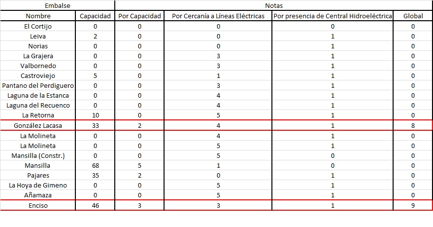 En definitiva con la tabla anterior se llegó a la selección de los embalses González Lacasa y Enciso, que será los que estudiarán para la posible localización de nuestra central hidroeléctrica.