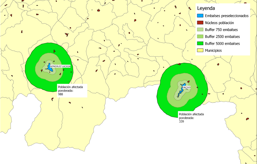 Para acabar, se aplicaron los criterios de cercanía a núcleos de población y número de habitantes en ellos. Se utilizaron buffer de 750, 2500 y 5000 m para determinar el área de influencia de cada embalse. La población que se veía afectada dentro de cada buffer se multiplicó por unos coeficientes de 2, 1.5 y 1 respectivamente. Para la solución final nos fijamos en la población ponderada a la que se abastecería, eligiendo como emplazamiento final aquel cuyo resultado fuera mayor.