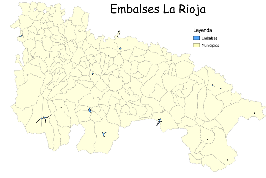 Para comenzar, se emplearon dos fuentes diferentes para la determinación de los embalses existentes en la comunidad. Una fue la cuenca hidrográfica del Ebro y la otra, la infraestructura de datos espaciales de La Rioja. La decisión de usar dos vectoriales distintos, tenía el fin detectar la falta de alguno de ellos en el otro. Tras observar que el primero era más completo, fue éste el que se empleó.