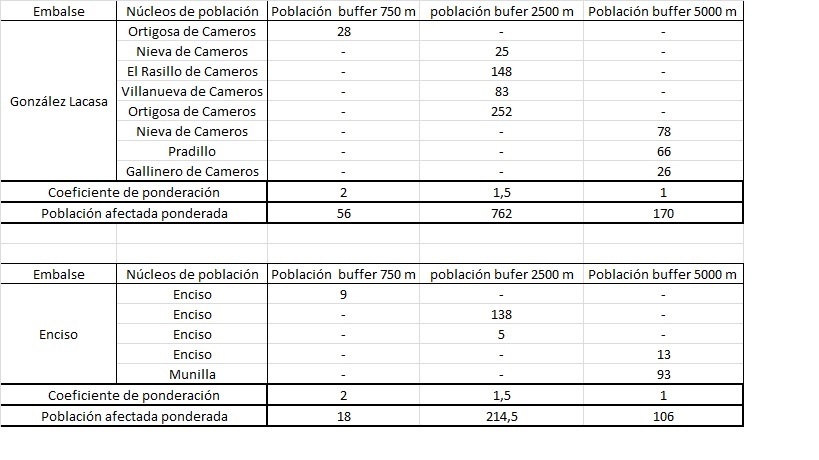 Para los resultados de la preselección, es decir, el embalse González Lacasa y el embalse Enciso llevamos a cabo la elaboración de las siguientes tablas según la población a la que afectan y teniendo en cuenta un coeficiente de ponderación según la distancia para obtener los siguientes resultados de población afectada ponderada: