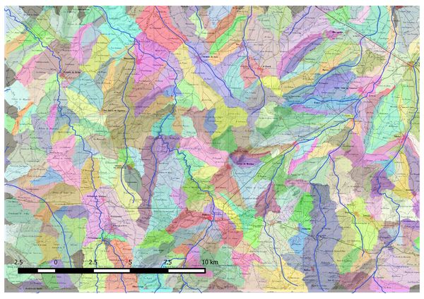 - Empleo de la herramienta complementaria de QuantumGIS conocida como GRASS, a través de la cual hemos obtenido la configuración final de nuestra cuenca así como la de las demás cuencas aledañas a esta. Dentro de este complemento hemos empleado las pautas de trabajo usuales, seguidas por el guion de la asignatura, que se centra en el empleo de órdenes de trabajo como r.watersehed, en la que hemos empleado un tamaño mínimo de celda de 160000. Una vez obtenido esta visualización gráfica lo hemos exportado a un formato vectorial para poder trabajar con él.
