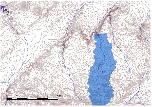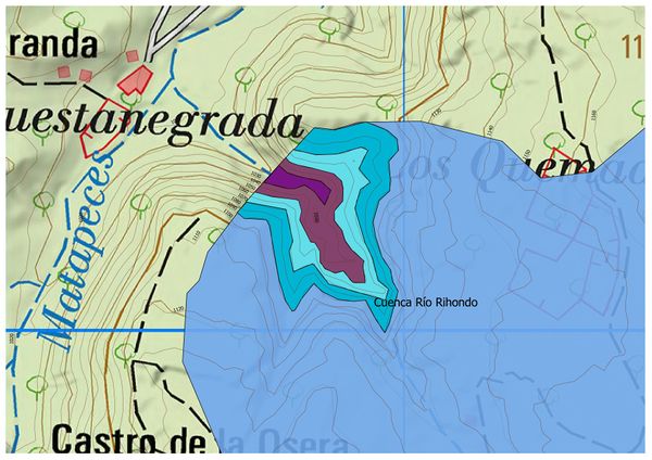 En primer lugar hemos analizado los municipios a abastecer y la superficie de regadío que se sitúa aproximadamente en 500 hectáreas de cultivos destinados principalmente a cereales de grano de invierno que son los más usuales de encontrar en todo el territorio. De esta manera, para conocer con la mayor precisión posible, la situación de nuestra presa y su posterior embalse se han extraído del modelo digital del terreno originario las posibles cuencas que podrían existir. Por consiguiente, hemos obtenido de forma unívoca la cuenca perteneciente al río Rihondo que plantea además un buen encaje en planta de la futura presa y que, debido a la cercanía a los núcleos urbanos del territorio, reduciría en gran medida los costes derivados de las conducciones.