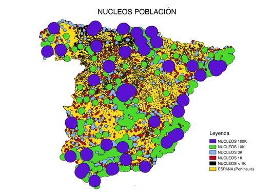 Primero, determinamos las distancias mínimas a las diferentes capas: Empezaremos dando un buffer de 10 kilómetros a la capa “contorno”. De esta forma, nos alejamos tanto de la costa, como de las fronteras internacionales. Capa de núcleos de población. Como no tenemos una referencia oficial, hemos determinado que una consideración lógica es establecer una distancia mínima a cada núcleo de población, de forma proporcional al número de habitantes (a mayor número de habitantes, mayor distancia). Con este criterio, hemos concluido que la distancia mínima es: para los núcleos de más de 100.000 habitantes, 30 kilómetros; para los núcleos de entre 100.000 y 10.000 habitantes, 15 kilómetros; para los núcleos de entre 10.000 y 3.000 habitantes, 7,5 kilómetros; para los núcleos de entre 3.000 y 1.000 habitantes, 5 kilómetros; y para los núcleos de menos de 1000 habitantes, 1 kilómetro. Dentro de las zonas protegidas, y según la importancia que se le da en la normativa, determinamos distancias mínimas: para los Parques Naturales, 10 kilómetros; para los Lugares de Interés Cultural (LICS), 7 kilómetros; y para las Zonas de Especial Protección de Aves (ZEPAS), una distancia de 5 kilómetros. Finalmente, para las zonas estratégicas, hemos determinado que una distancia prudencial mínima, que evitaría posibles incidentes en caso de problemas inesperados, es la de 15 kilómetros para puertos, aeropuertos y centrales eléctricas.