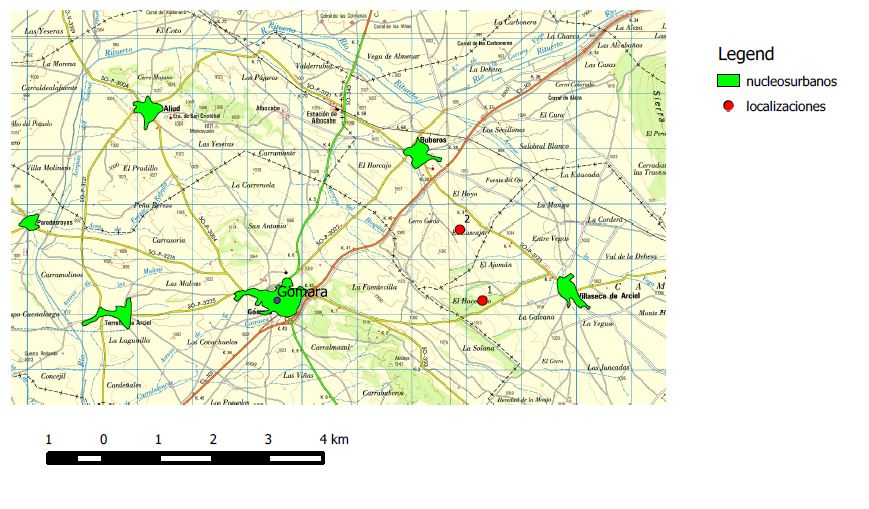 Tras el estudio realizado, existen dos zonas que cumplen los requisitos que hemos expuesto, señaladas en el mapa adjunto con puntos. Pero estos requisitos solo se fijan en condiciones ambientales, para poder decantarnos por una de las dos opciones estudiamos en la página del catastro la situación de cada uno, observamos que en el primer punto no existía ninguna parcela por ser una zona protegida, al contrario del segundo, motivo suficiente para decantarnos por este último.