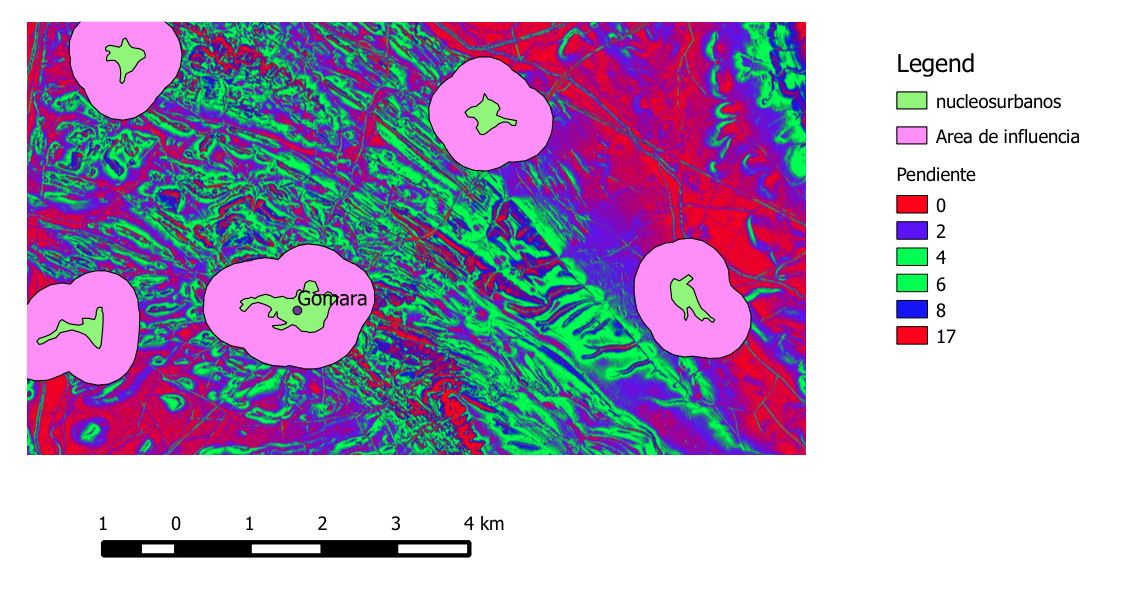 Con los datos obtenidos y el programa QSIG hemos desarrollado el mapa de pendientes mostrado a continuación, el cual dividimos en zona verde, azul y roja, de acuerdo a la cercanía a la pendiente óptima que como se expuso en el apartado 3 no debe ser excesiva pero tampoco escasa.