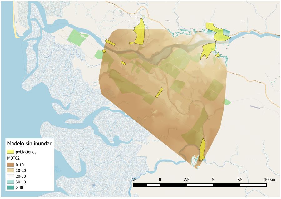 Hemos partido de un archivo shape que nos facilitó Edgar Ortiz, de la oficina local del Ministerio de salud de Costa Rica, que contenía las curvas de nivel de la zona. Para obtener el MDT del área de estudio optamos por el uso del programa Global mapper. Introdujimos el archivo shape facilitado, que contiene curvas de nivel cada dos metros y con una funcionalidad del programa se genero el archivo MDT en formato .asci, que posteriormente usaremos en QGis. En QGis introdujimos el archivo .asci y modelamos las diferentes capas de inundación con el comando r.lake.seed, para diferentes cotas de las laminas de agua, medidas sobre el nivel del mar. Las cotas elegidas fueron 8, 10, 12, 18, 20 y 22 metros por encima del nivel del mar. Las láminas de agua se introdujeron en un archivo de tipo shape cada una con atributos de altura. Posteriormente digitalizamos las comunidades de Palmar Norte, Palmar sur, Ciudad Cortés, los dos aeródromos que hay en la zona, así como la ciudad de Sierpe. Para ello nos descargamos el complemento del programa llamado Openlayers, y activamos la capa de mapas llamada Open Street map, en el que podemos ver el mapa de la zona. Con este mapa de fondo, creamos una capa vectorial, y digitalizamos con polígonos dichos centros. A cada polígono les añadimos atributos, de nombre, de cota respecto al nivel del mar, y del calado que tiene cada lámina de agua en cada población. Las cotas y el calado se han obtenido con las herramientas raster de QGis. Con estas se puede comprobar si a esa altura hay inundación y que altura de inundación hay para cada lámina de agua posible.