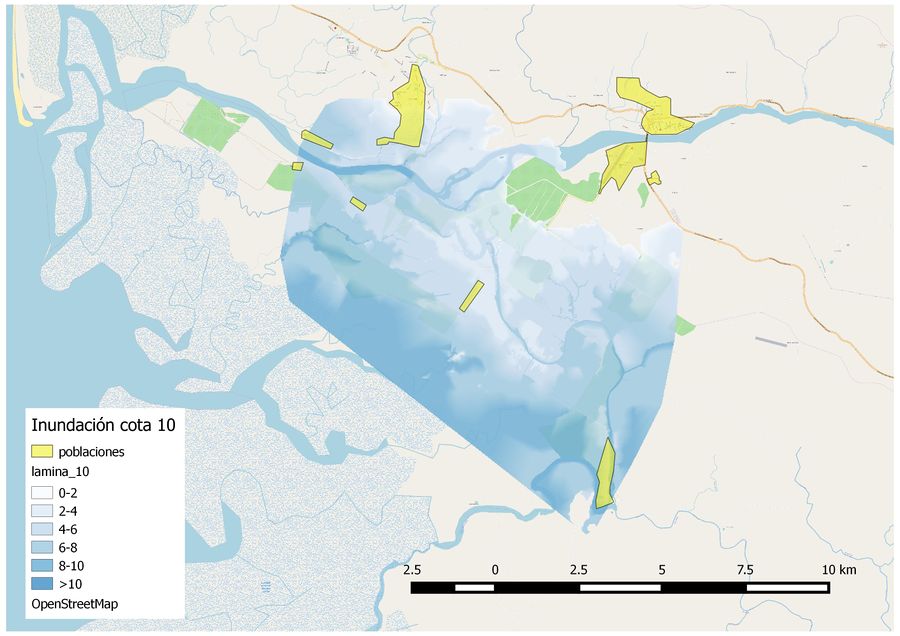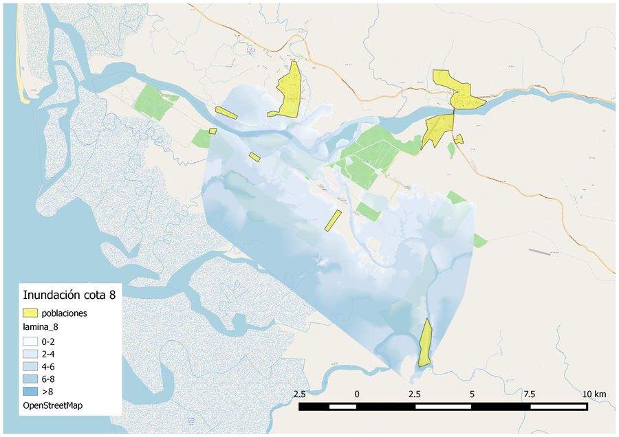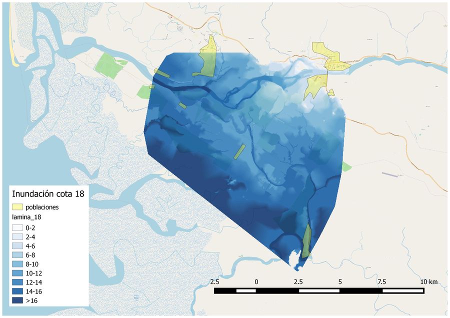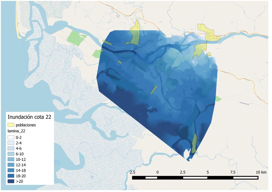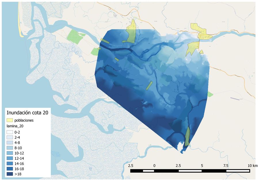 Como resultados del estudio hemos obtenido 7 mapas. Cada uno de los mapas corresponde a una cota de inundación, siendo las cotas estudiadas: 8, 10, 12, 18, 20 y 22, de especial interés la cota 20 por encontrarse el puente que cruza el río a dicha cota. Los diferentes resultados se pueden observar en el Anejo. Al observar las diferentes imágenes de las distintas cotas de inundación cabe destacar que a la cota 8 la mitad del territorio de Ciudad Cortés, algún aeropuerto y varias fincas quedan anegadas. A partir de la cota 18 la totalidad de las poblaciones cercanas al río quedan inundadas. Al sur de nuestra zona se encuentra el Humedal Nacional Térraba Sierpe, que como se puede intuir a la vista de los mapas se va a ver afectado por las inundaciones. También podemos ver que la Carretera Interamericana Sur y la Carretera Pacífica Fernández Oreamuno quedan totalmente afectadas en nuestra zona de estudio.