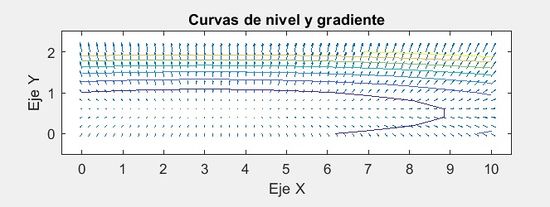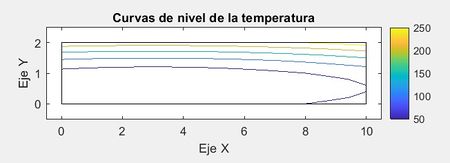 La temperatura viene dada por la función [math] T(x, y) = (x − 3)^2 + (10(y-1/2))^2 [/math] , para obtener las curvas de nivel usamos el comando contour