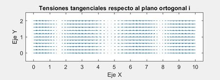 Podemos observar que oscilan entre unos valores máximos y mínimos, cambiando con un frente de onda paralelo al Eje Y de manera gradual y progresiva. Esto era predecible por el hecho que la tensión tangencial respecto al plano ortogonal venia descrito por una función trigonométrica dependiente de x.