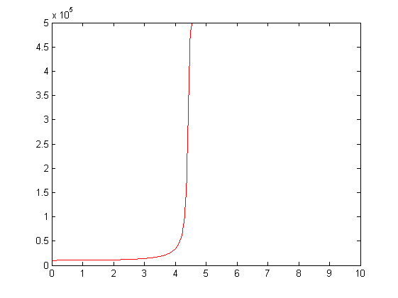 c es un número de dos decimales comprendido entre [math] 0.01 [/math] y [math] 0.99 [/math]. Siendo N igual a 500000 con las siguientes condiciones iniciales: [math] I(0)=200 [/math] y [math] I(1)=500 [/math] Para determinar c imponemos la siguiente condición, que [math] |I(1)-500| [/math] tenga el menor valor posible, es decir, aquel valor que minimice lo posible el error absoluto. Para hallar ese valor lo hallaremos numéricamente con el siguiente programa escrito en MATLAB, basado en el método de Euler para la resolución de ecuaciones diferenciales: