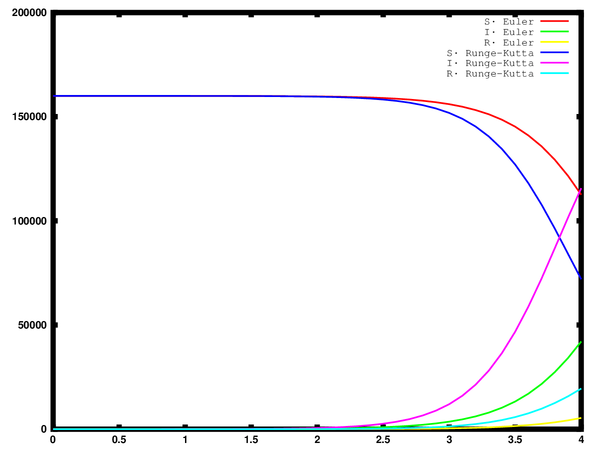 Podemos ver que ambos métodos dan prácticamente el mismo gráfico, se puede apreciar un aumento continuo en el número de infectados por lo que no tiende a desaparecer ni tampoco se aprecia un momento de máximo número de infectados ya que no para de crecer.