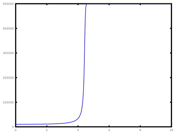 % el resto del código sería igualEn el primer gráfico podemos ver que el número de infectados tiende a desaparecer ya que el número inicial es inferior a 10.000, por lo que el número de infectados máximo en ese caso es de 9.700 personas enfermas que es el número de contagiados que habían al principio. En cambio, en los otros dos gráficos tiende a crecer el número de individuos enfermos, por haber más de 10.000 individuos infectados con la única diferencia de que en el tercer gráfico crece más rápido que el segundo por haber más individuos infectados al principio en el tercer gráfico que en el segundo. Y el número máximo de individuos enfermos podríamos decir que es de toda la población, es decir 500.000 durante un tiempo indefinido, porque el modelo no contempla la posibilidad que algunos de sus habitantes se curen durante la epidemia.