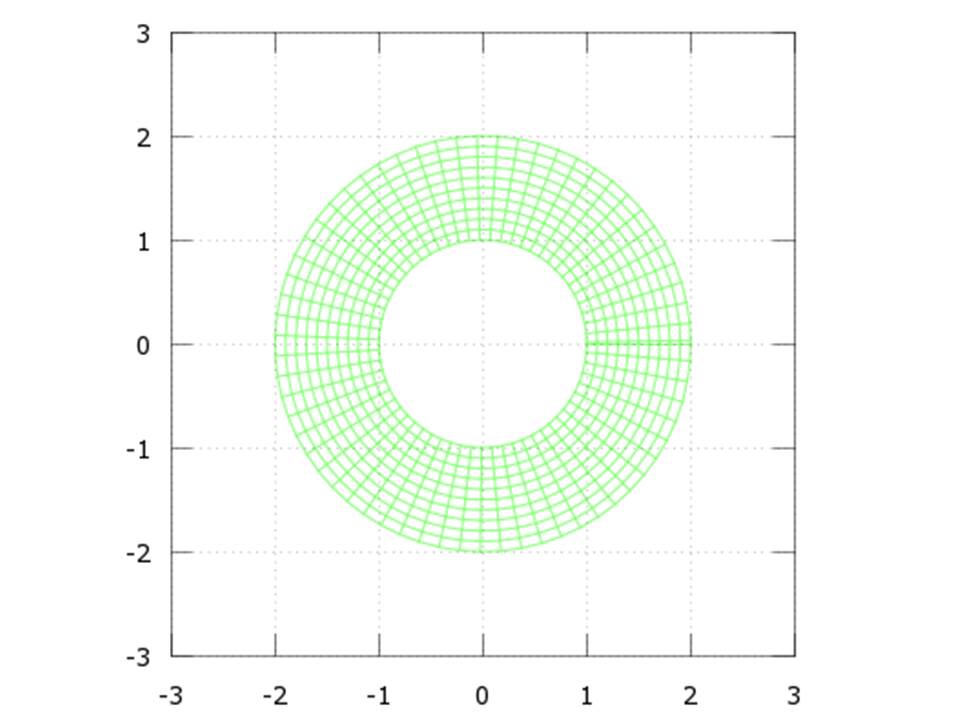 Se considera una placa plana con forma de anillo circular centrado en el origen y comprendido entre los radios 1 y 2. La placa tiene un grosor de 0,2 metros y su densidad d depende del radio, es decir, d(ρ,θ,z)= 1/ρ kg/cm^3.