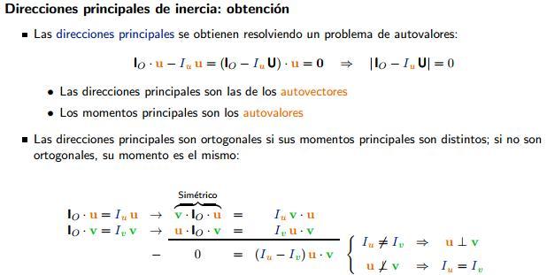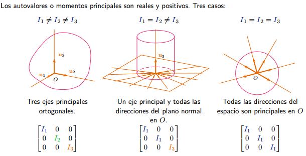 Sabemos que las direcciones principales de inercia, que se producen cuando la velocidad instantánea de rotación Ω y el momento cinético HO = IO • Ω son paralelos , es decir, HO = λ • Ω. Estas direcciones coinciden con los autovalores de este tensor y los ejes principales son los vectores propios asociados a dichos autovalores del tensor IG.
