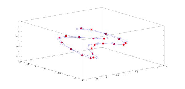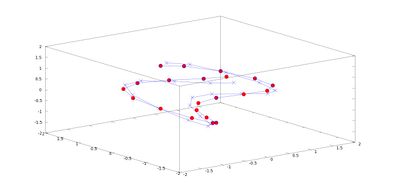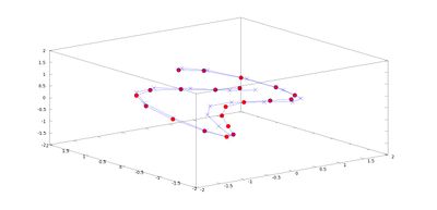 Para empezar a dibujar un sistema de partículas primero tenemos que generarlos. En nuestro caso, tenemos 21 partículas que inicialmente se encuentran en las coordenadas (xi ,yi ,zi) = (sin(π(i − 1)/10,cos(π(i − 1)/4), cos(π(i −1)/10) para i = 1, 2, ..., 21 respecto a la base ortonormal {e1,e2,e3}. Supondremos que nuestras partículas están unidas por un alambre de masa despreciable de manera que su posición relativa no cambia.