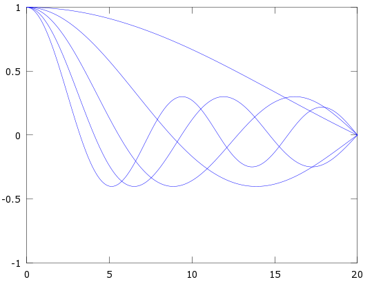 Este problema se asimila a uno de Bessel de primera especie cuyas autofunciones son del tipo [math]Ψ(\rho)=J_0·(\rho\sqrt{λ})[/math] y si tomamos [math] ρ=20 [/math] obtenemos los 5 primeros autovalores del problema asociado: :