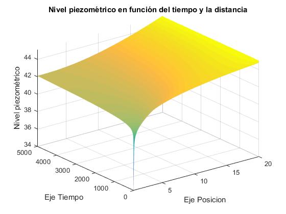 title('Nivel piezométrico en función del tiempo y la distancia');